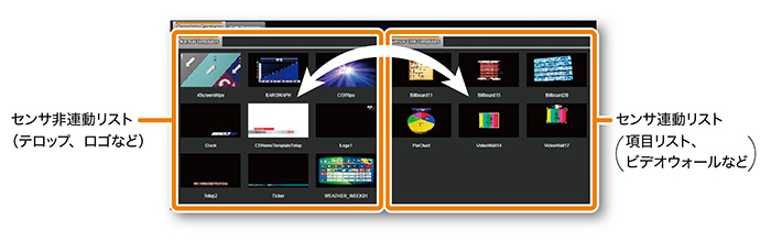 センサ非連動リストとセンサ連動リスト間でテンプレートをドラッグ&ドロップすることで連動設定を変更
