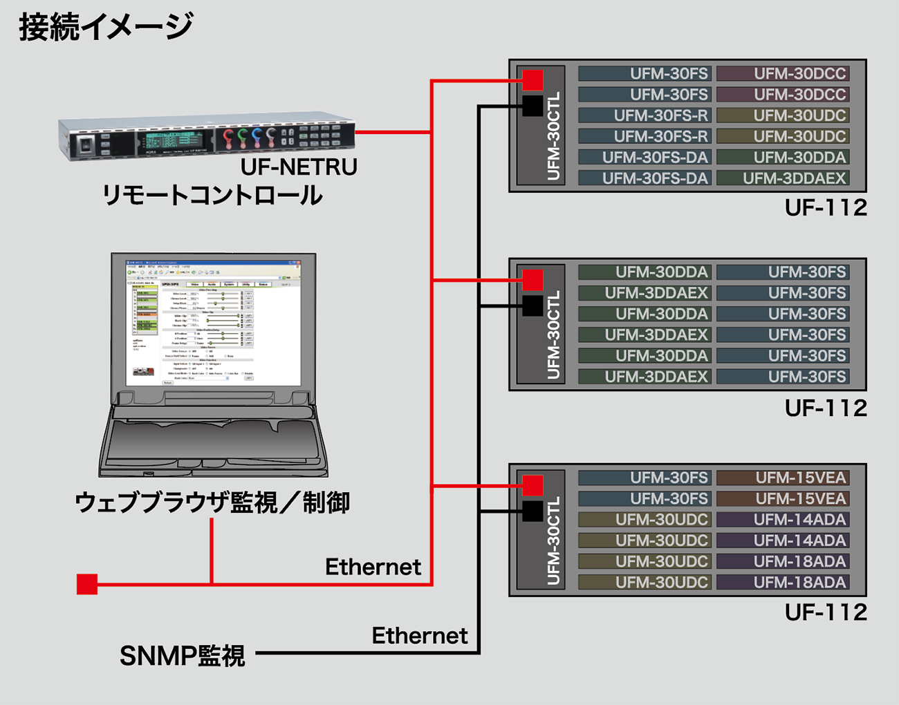 ※UFM-30CTL 対応モジュール: UFM-30FS、30FS-R、30FS-DA、30DCC、30UDC、30DDA/30DDAEX、15VDA*、15VEA*、18VDA*、14ADA*、18ADA* *UFHM-IFBが必要 - リモートコントロールユニットUF-NETRU または DCC-NETOUを接続することで、ネットワーク上から各種制御が可能