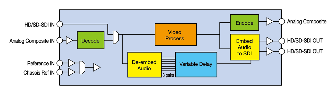 - HD/SD-SDI、アナログコンポジット入出力対応1080/59.94i, 1080/50i, 720/59.94p, 720/50p, 525/60, 625/50をはじめとする様々なフォーマットの入力、フレームレート変換をサポートします。