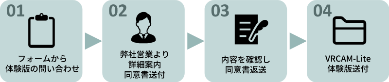 VRCAM-Lite体験版を無償でお試しいただけます。こちらの フォームからお問い合わせください。