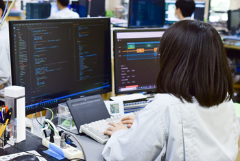配属当初はPCの環境構築や書類仕事などが多かったです。仕事に慣れてきたころから、先輩の指導のもとGUIの設計業務に携わるようになりました。プログラミング自体は学生時代から行ってきましたが、学生時代と違い、品質や保守性を考えながら設計しなければなりません。最初の方は苦労しましたが、少しずつできるようになりました。現在は、新規開発中の製品のWeb GUI設計をメインで担当しています。設計業務の傍ら、部内サーバーの管理も行っています。
