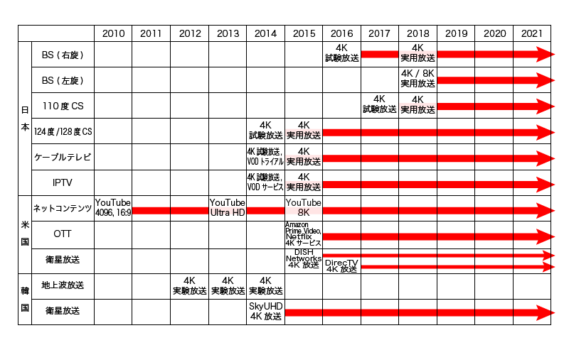 韓国では、2012年から地上波放送の実験放送の取り組みが開始され、2012年、2013年、2014年の数カ月間の期間限定で実験放送が行われました。2013年からケーブルテレビ放送での4K試験放送が開始され、2014年には衛星放送SkyUHDが開局しています。