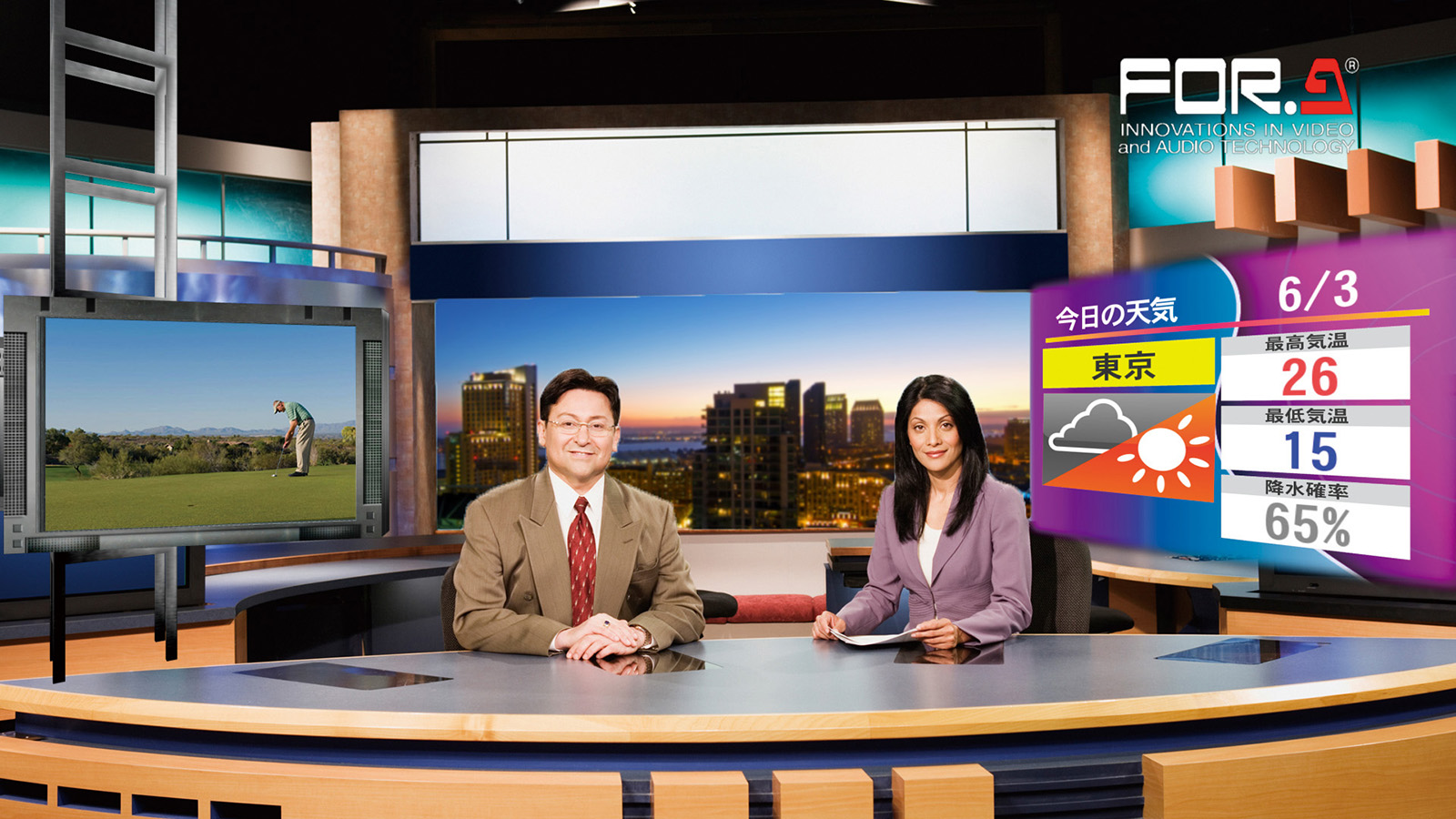 バーチャルスタジオは、クロマキー映像を3DCGのスタジオセットと組み合わせることで、実際のスタジオにいるかのような映像を実現する技術です。クロマキー映像から、キーとフィルを生成し、3DCGのスタジオセットに配置していきます。時には、背景のビデオウォールに別の映像を挿し込んだり、トピックスを表示するメニューグラフィックスを浮き上がらせたり登場人物の動きに合わせてグラフィックスを追加/変更したりするリアルタイムCGを追加することもあります。リアルタイムCGによる番組演出は欠かせないものとなりましたが、4K/8Kといった高解像度の次世代映像制作時代に入りつつある今、バーチャルスタジオも再度活用が拡がりつつあります。